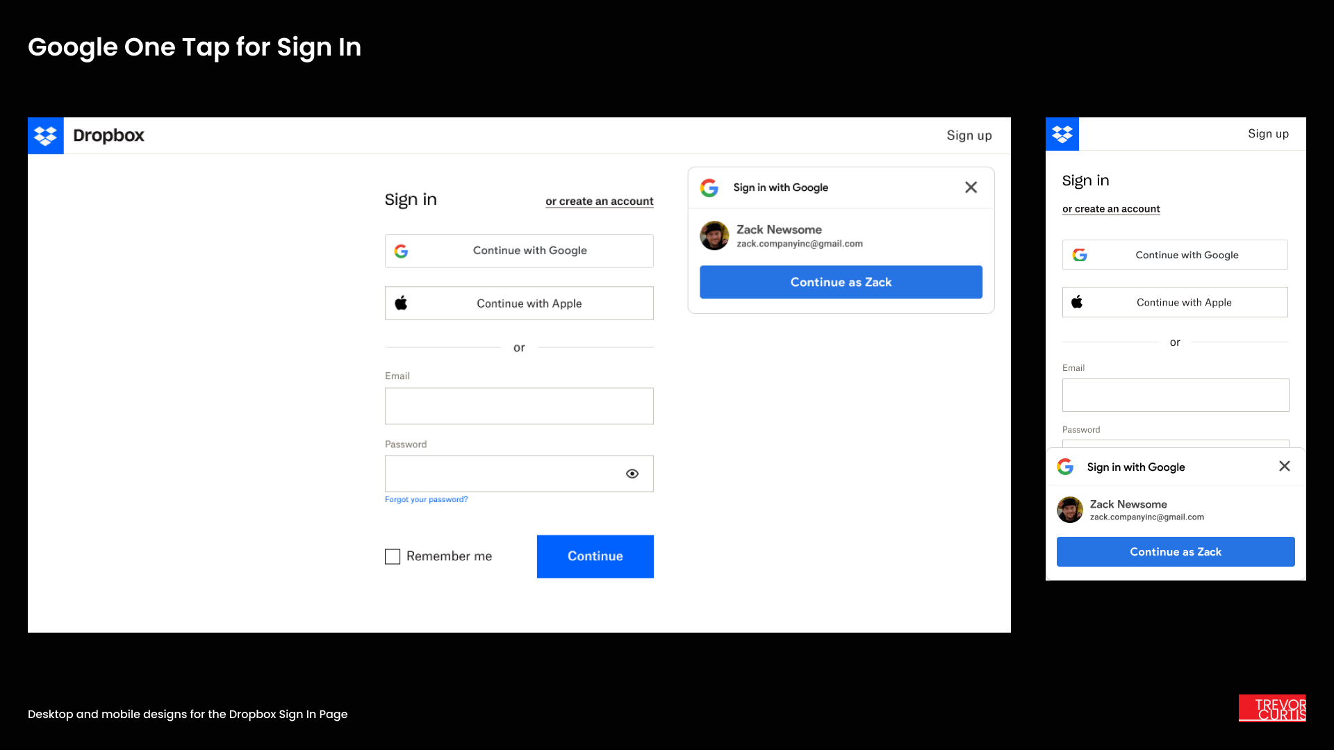 Google One Tap could be used in other vital SUSI experiences, such as on the Dropbox Homepage or during the file sharing process inside the Dropbox product. Further consistency both in and out of the product would increase user confidence and enhance Dropbox’s reputation of privacy and security.