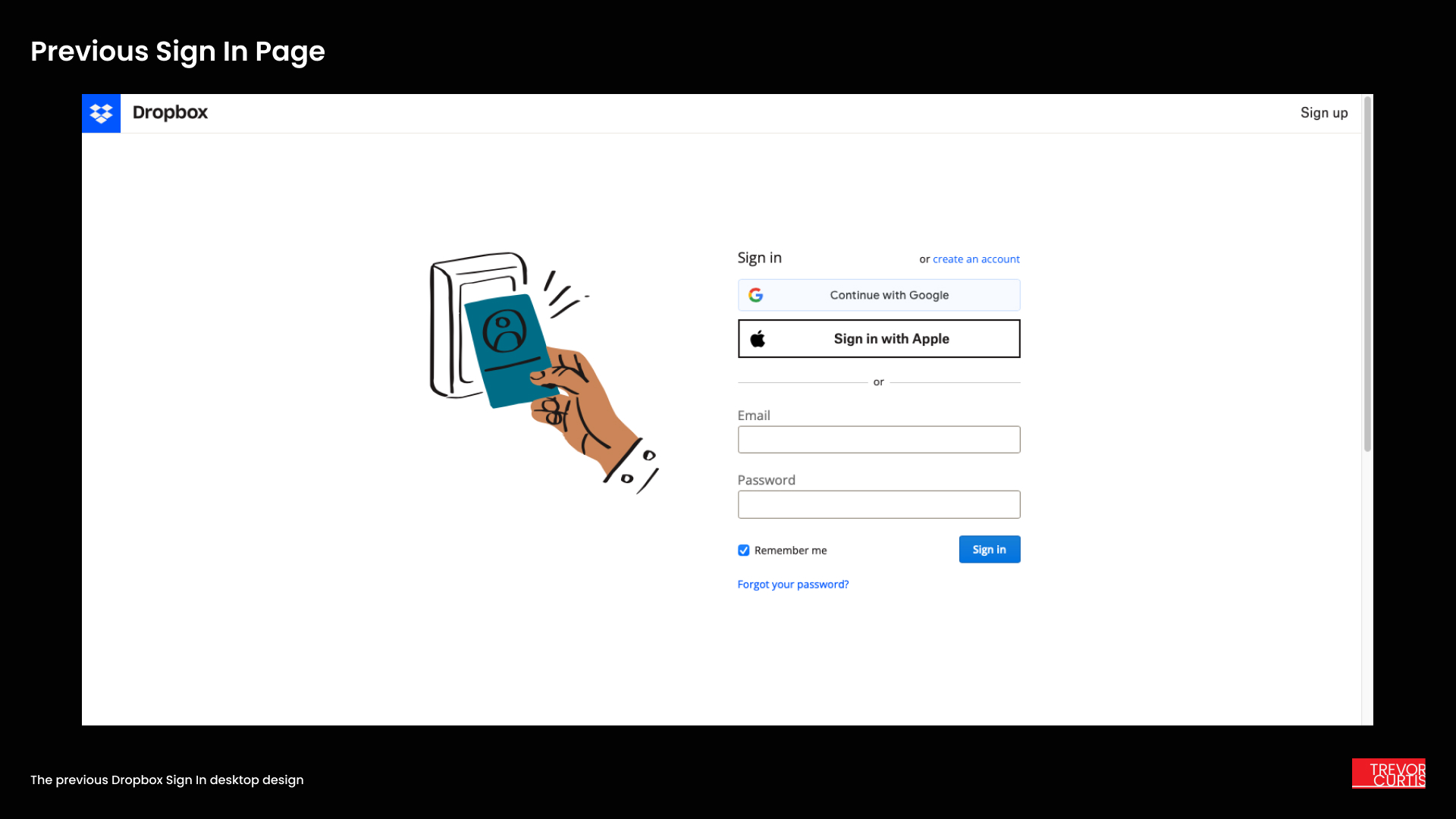 Page speed and the visual experience would be improved by only loading the current design system code rather than relying on older styles from a previous design. This would improve security and user trust in Dropbox by offering a consistent experience that matched the other areas of the website. It would allow me to design a unified SUSI experience to be used on other products like Dropbox Paper and Replay.