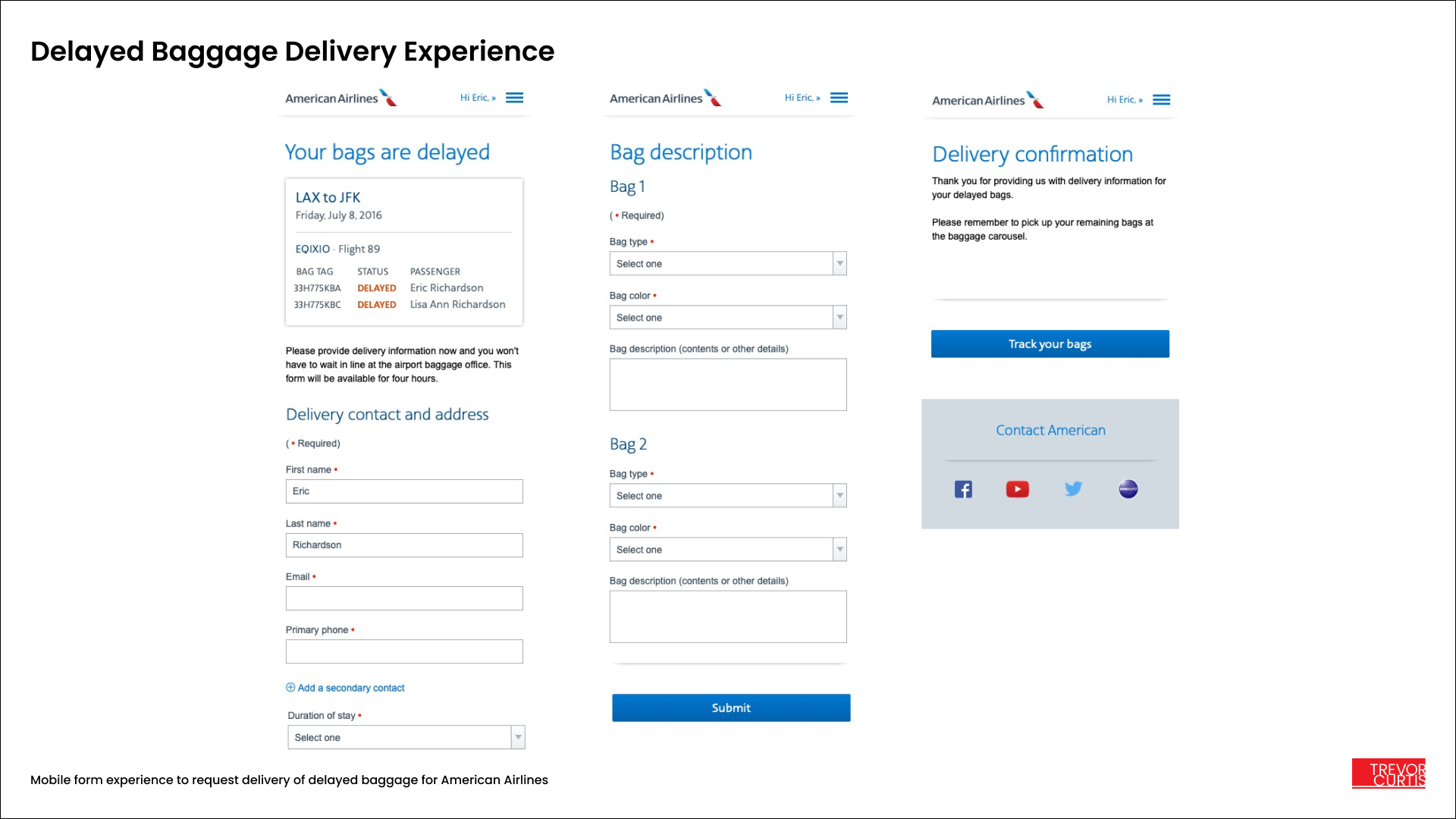 I designed a customized delayed baggage delivery experience for passengers whose bags are delayed upon arrival. Passengers have the option of requesting that their bags delivered to a specific address upon arrival. To lower complaint calls to the FAA due to lost baggage, I was tasked with designing a streamlined baggage request experience that allowed passengers to give American Airlines details about where would like the bags delivered without having to speak to an agent or call the airline.
