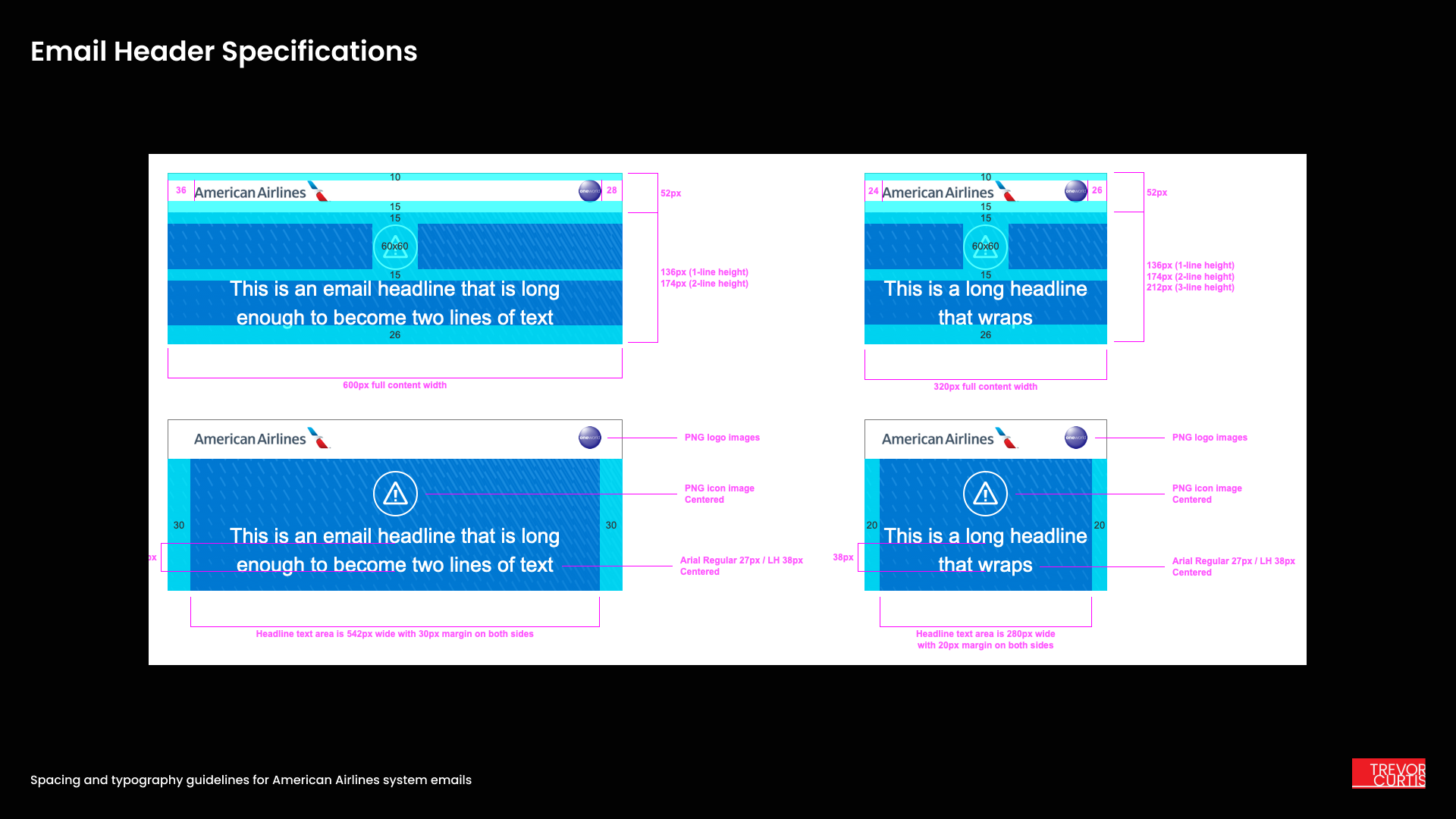 I designed all of the American Airlines system update emails that are sent out to passengers for flight cancellations, departure changes, and checked luggage status. Each template is optimized for a desktop and mobile presentation, and great care was taken to accommodate long titles and a dense presentation of important flight details. Color and typographical sizing communicate important information at a glance. I was able to make use of American’s large custom icon library in the header area to add some delight to what would otherwise be a very stressful communication for passengers.